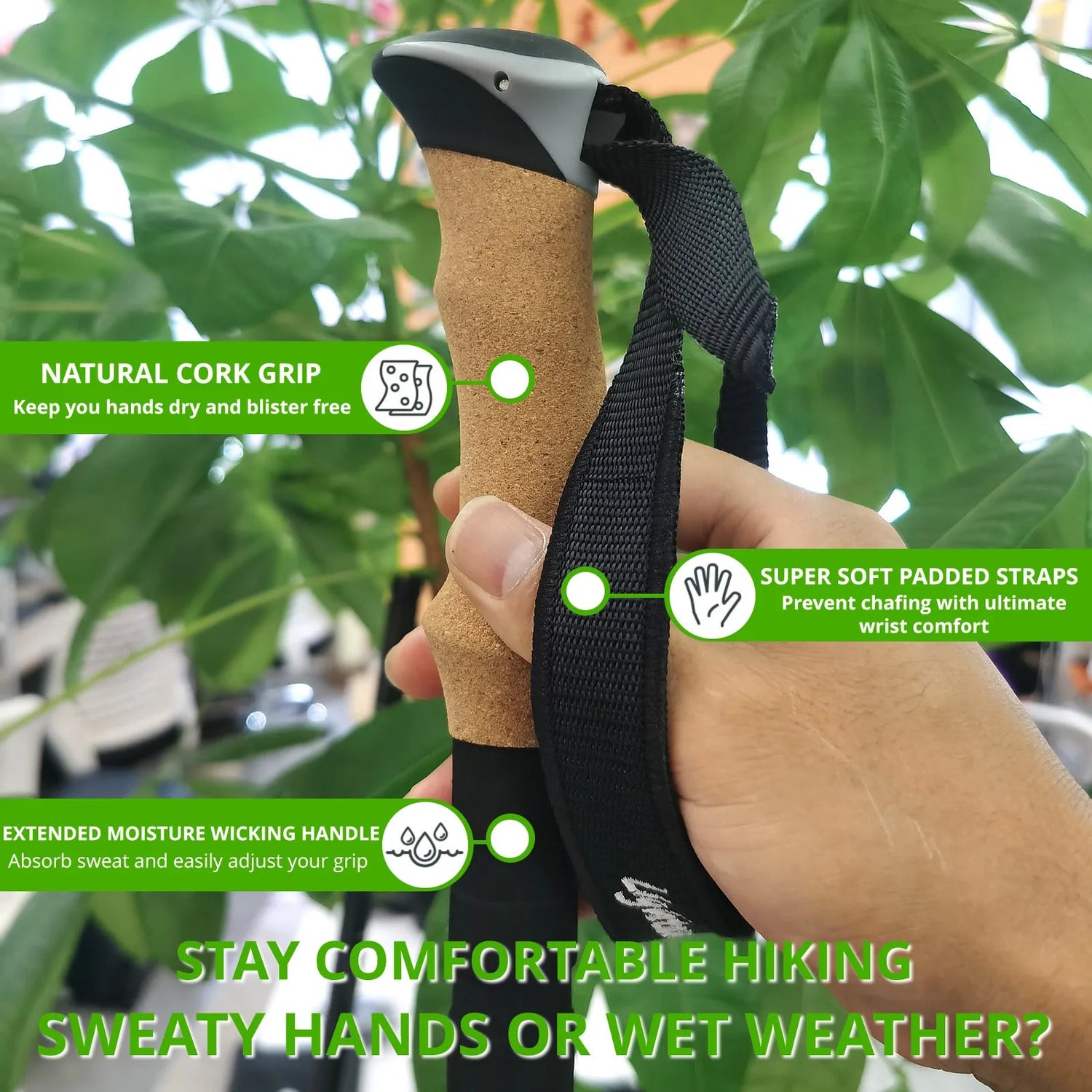 Handle Material - Cork: Provides a comfortable, ergonomic grip that absorbs sweat and prevents slippage, reducing hand fatigue during long hikes.